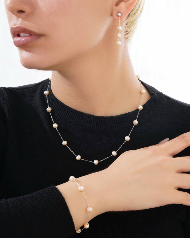 سرویس وارداتی مروارید یک رج صورتی نقره جواهری زنانه کد 60676